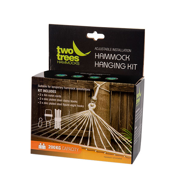 The hammock hanging kit contains 2 x 4m nylon cords, 2 x zinc plated steel clamp hooks and 2 x Figure ‘8’ hooks.